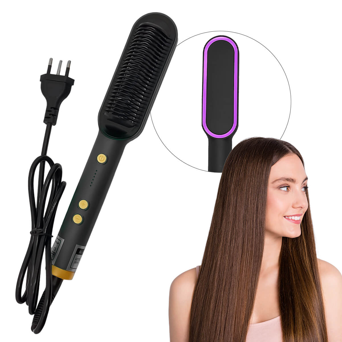 A Escova Alisadora Bivolt é perfeita para quem deseja cabelos alinhados e com brilho em poucos minutos. Com aquecimento rápido graças à tecnologia PTC e controle de temperatura ajustável de 130°C a 200°C, proporciona um alisamento prático e eficiente, sem agredir os fios. Seu design moderno facilita o manuseio, enquanto a luz indicadora de funcionamento garante segurança durante o uso. Ideal para todos os tipos de cabelo, pode ser utilizada diariamente com praticidade, inclusive em viagens, graças ao sistema bivolt automático.