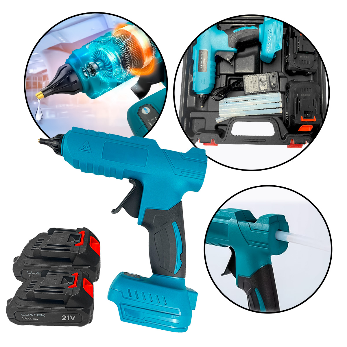 A Pistola de Cola Quente Profissional 21V foi desenvolvida para oferecer máxima mobilidade, potência e segurança em trabalhos de artesanato, bricolagem, reparos domésticos e uso profissional. Sem fio e com bateria de lítio de alta capacidade, proporciona autonomia de até 3 horas por carga, ideal para longas sessões de trabalho. Seu design robusto com bico emborrachado e empunhadura ergonômica garante maior controle e conforto. Possui aquecimento rápido, sem gotejamento e é compatível com bastões de cola de 11 mm. Acompanha maleta para transporte e 6 bastões inclusos, pronta para uso imediato.